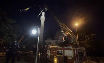Cami yönetimi, vatandaşlara dikkatli olmaları hususunda uyarılarda bulundu. İtfaiye ekipleri, minarenin külahını sökmek için geniş güvenlik önlemleri altında cami alanına intikal etti.