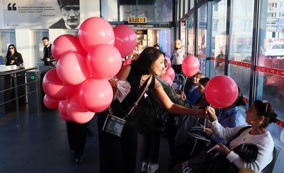 İZDENİZ iş birliğiyle düzenlenen etkinlikte, kadınlar vapura pembe balonlarla katıldılar. Burada, kadınların meme kanserine karşı nasıl muayene yapacaklarına dair broşürler dağıtıldı.