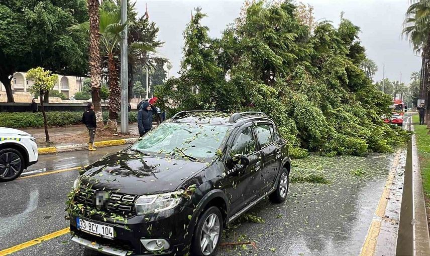 Mersin'de etkili olan yağmur nedeniyle kökünden sökülen bir ağaç, seyir halindeki üç araca zarar verdi. Olayda hiçbir yaralanma yaşanmaması sevindirici bir durum oldu.