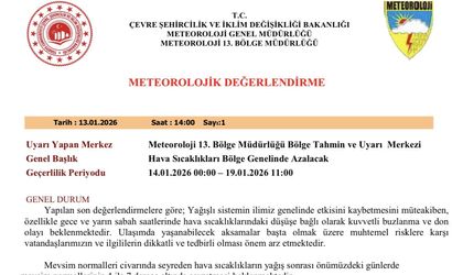 Meteoroloji 13. Bölge Müdürlüğü'nden alınan bilgilere göre; son değerlendirmelere göre, yağışlı sistemin etkisini kaybetmesinin ardından, özellikle gece ve yarın sabah saatlerinde hava sıcaklıklarının düşmesi beklenmektedir. Bu durum, kuvvetli buzlanma ve don olaylarını beraberinde getirebilir.