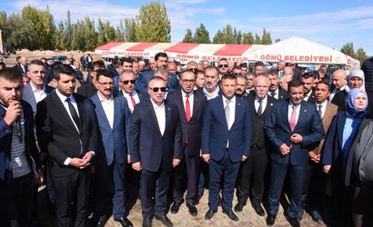MHP Genel Başkan Yardımcısı İzzet Ulvi Yönter (ön sağ 2), memleketi Afyonkarahisar'ın Emirdağ ilçesine bağlı Çiftlik köyünde Kaymakamlık tarafından yaptırılan "Çok Amaçlı Salon"un temel atma törenine katıldı.