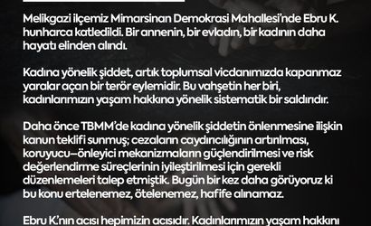 Ersoy, açıklamalarında Melikgazi ilçesinde yaşanan bir cinayete atıfta bulunarak şöyle konuştu: "Bir kadın cinayeti daha. Ebru K. hunharca katledildi. Bir annenin, bir evladın, bir kadının hayatı elinden alındı." Bu tür trajik olayların, toplumda derin yaralar açan bir terör eylemi haline geldiğine dikkat çekti.