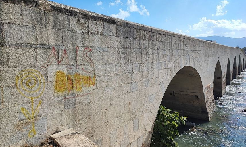 ADANA’NIN YÜREĞİR İLÇESİNDEKİ ANADOLU'NUN İLK ROMA KÖPRÜSÜ OLARAK BİLİNEN MİSİS KÖPRÜSÜNE SPREY BOYA İLE YAZILAMA YAPILDI.