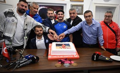 Norveç'te düzenlenen Dünya Halter Şampiyonası'nda koparmada 145 kiloyla altın, silkmede ise 179 kiloluk derecesiyle gümüş ve toplamda 324 kiloyla rekor kırarak 2025 dünya şampiyonu olan milli halterci Muhammed Furkan Özbek'in (solda) başarısı için ASKİ Spor Kulübü'nde pasta kesilerek, kutlama yapıldı. Kutlamaya ASKİ Spor Kulübü Genel Koordinatörü Abdullah Çakmar (sağda) da katıldı.
