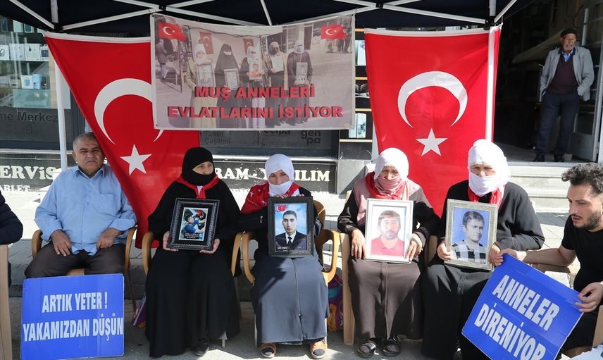 Muş'ta çocukları terör örgütü PKK tarafından kaçırılan aileler, DEM Parti İl Başkanlığı binası önündeki eylemlerine devam etti. "Anneler direniyor", "Evlat nöbetindeyiz" ve "Artık yeter yakamızdan düşün" yazılı pankartlar açan anne ve babalar, fotoğraflarını taşıdıkları evlatlarına teslim olmaları için çağrıda bulundu.