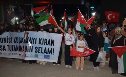 Muş'ta, İsrail'in Gazze'ye yönelik saldırılarına karşı düzenlenen yürüyüş ve basın açıklamasında, katılımcılar seslerini yükseltti. Yatsı namazı sonrası Mescid-i Aksa Platformu öncülüğünde Muş Kent Meydanı'nda gerçekleştirilen etkinliğe Türk ve Filistin bayrakları taşıyan katılımcılar pankart açarak, tekbir getirip slogan attılar.