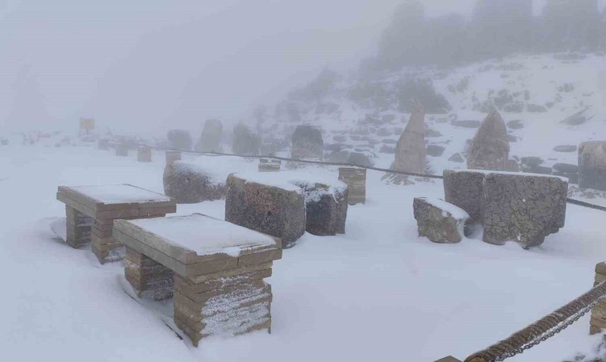UNESCO Dünya Kültür Mirası Listesi’nde yer alan 2206 metre yükseklikteki Nemrut Dağı’na mevsimin ilk karı düştü. Adıyaman ilinde bulunan bu ünlü dağın devasa heykelleri, karın beyaz örtüsüyle kaplandı.