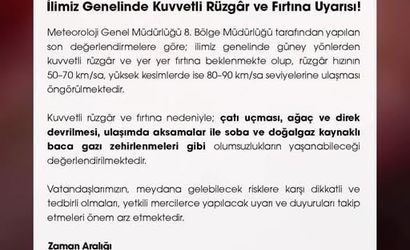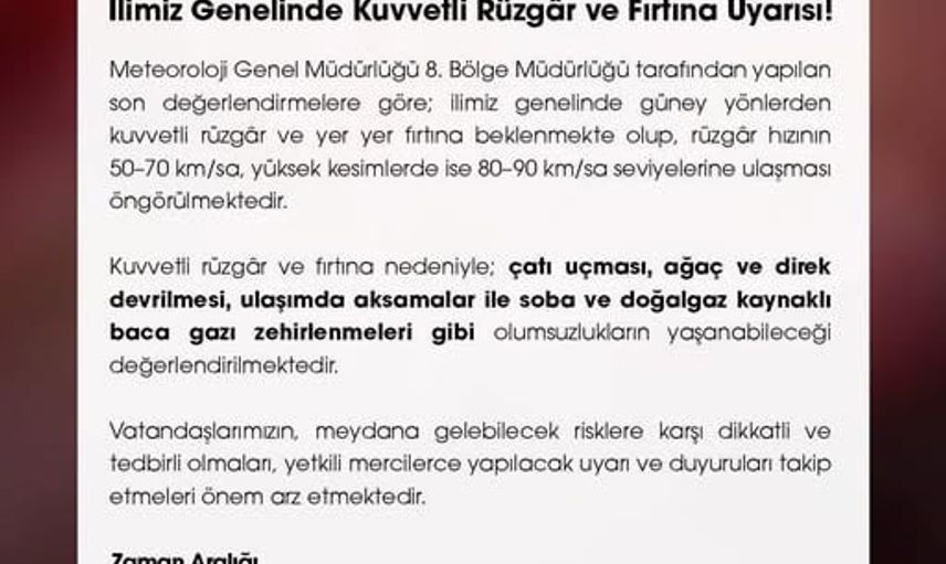 Valilikten yapılan duyuruda, bu kuvvetli rüzgar ve fırtınanın, çatı uçmaları, ağaç ve direklerin devrilmesi, ulaşımda aksamalar gibi olumsuz sonuçlar doğurabileceğine dikkat çekildi. Ayrıca, soba ve doğalgaz kaynaklı baca gazı zehirlenmeleri gibi durumların da yaşanabileceği vurgulandı. Vatandaşlara Dikkatli Olmaları Tavsiye Edildi