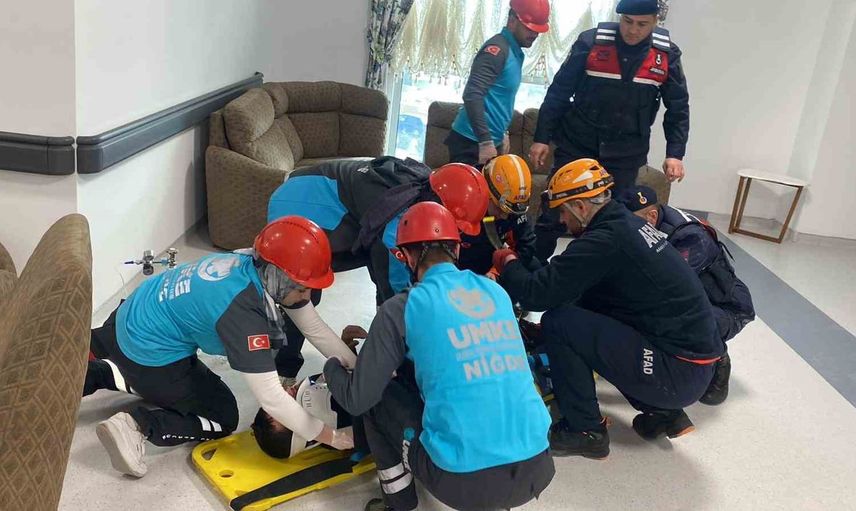 Deprem sonrası yangın çıkan Niğde Ömer Halisdemir Eğitim ve Araştırma Hastanesi Palyatif Servisi’ndeki hastaların güvenli bir şekilde tahliyesi sağlandı. Aynı zamanda, yangına müdahale ve sağlık hizmetlerinin sürekliliği fiel uygulamalı olarak yürütüldü.