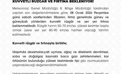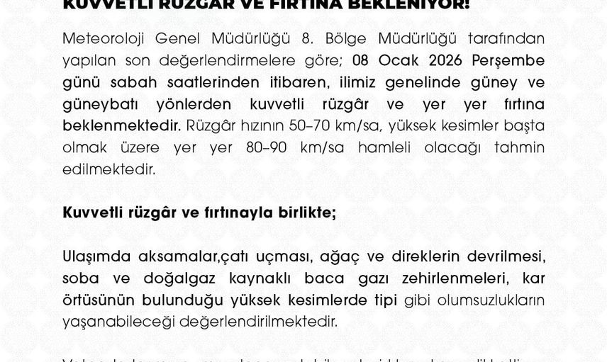 Yapılan açıklamada, rüzgar hızının 50-70 km/saat arasında, yüksek kesimlerde ise 80-90 km/saat hamleli olmasının tahmin edildiği belirtildi. Ayrıca şöyle denildi:“Kuvvetli rüzgar ve fırtınanın yol açabileceği olumsuzluklar arasında ulaşımda aksamalar, çatı uçmaları, ağaç ve direklerin devrilmesi, soba ve doğalgaz kaynaklı baca gazı zehirlenmeleri ile tipi gibi durumlar yer alıyor. Vatandaşlarımızın meydana gelebilecek risklere karşı dikkatli ve tedbirli olmalarını, yetkili mercilerin uyarı ve yönlendirmelerine uymalarını rica ediyoruz.”