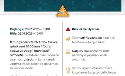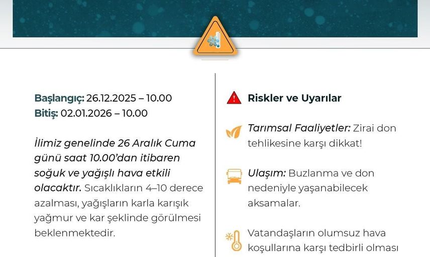 Açıklamaya göre; 26 Aralık 2025 Cuma günü saat 10.00'dan itibaren Balkanlar üzerinden gelecek soğuk ve yağışlı havanın Niğde'de etkili olması bekleniyor. Uyarının 2 Ocak 2026 Perşembe günü saat 10.00'a kadar devam edeceği bildirilmiştir.