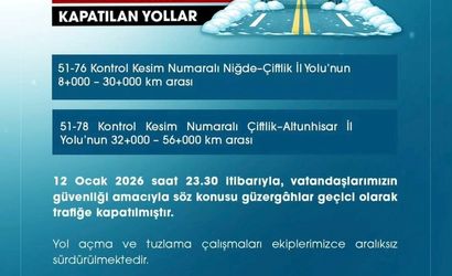 Valilikten gelen bilgiye göre, Niğde-Çiftlik yolunun 8 ile 30. kilometreleri arasındaki bölüm ve Çiftlik-Altunhisar yolunun 32 ile 56. kilometreleri, vatandaşların can ve mal güvenliğini sağlamak amacıyla 12 Ocak 2026 saat 23.30 itibarıyla trafiğe kapatılmıştır.