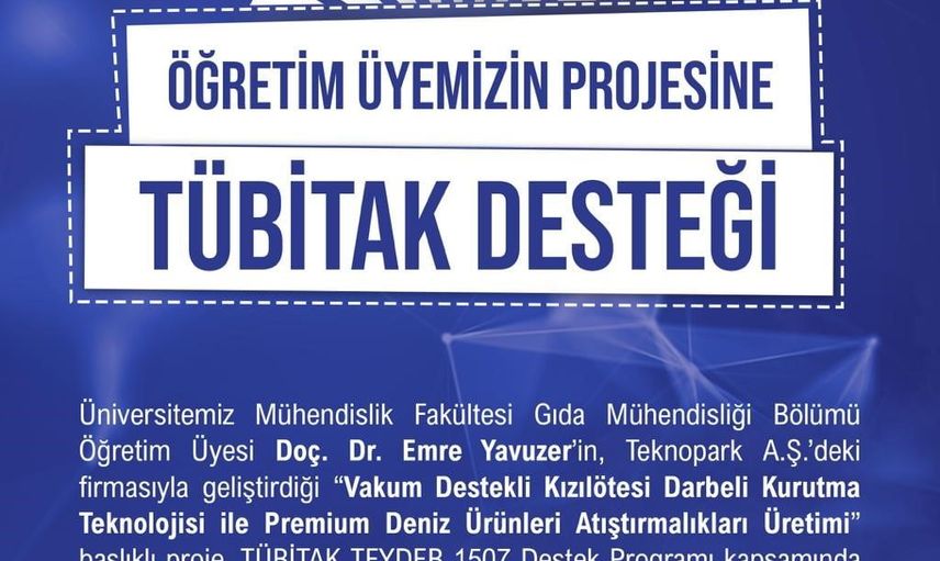 Proje, 'Vakum Destekli Kızılötesi Darbeli Kurutma Teknolojisi ile Premium Deniz Ürünleri Atıştırmalıkları Üretimi' başlığı altında yürütülecek. Bu teknoloji aracılığıyla, deniz ürünlerinin besin değeri ve duyusal özelliklerini en üst düzeyde korumak amaçlanıyor. Geleneksel kurutma yöntemlerine göre daha uzun raf ömrüne sahip, kalite kaybı minimum düzeyde olan ve tüketici beklentilerine uygun nitelikte yeni atıştırmalık deniz ürünlerinin geliştirilmesi planlanıyor.