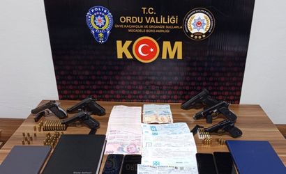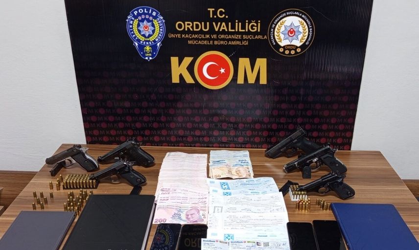 Ünye Cumhuriyet Başsavcılığı’nın koordinasyonunda, İl Emniyet Müdürlüğü Kaçakçılık ve Organize Suçlarla Mücadele Şube Müdürlüğü tarafından yürütülen çalışmalar sonucunda, Ünye ilçesinde toplamda 8 adrese operasyon düzenlendi. Yapılan operasyonlarda, 6 adet ruhsatsız tabanca, 42 bin 100 TL nakit para, 120 adet fişek ve çok sayıda senet ile alacak verecek defteri ele geçirildi.