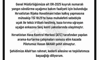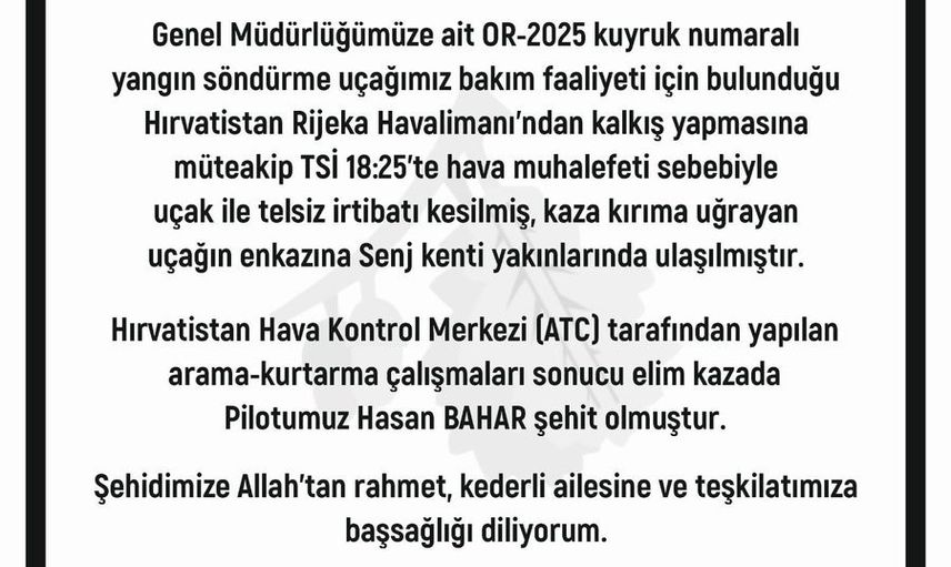 Karaçabey, sosyal medya üzerinden yaptığı açıklamada, "Genel Müdürlüğümüze ait OR-2025 kuyruk numaralı yangın söndürme uçağımız bakım faaliyeti için bulunduğu Hırvatistan Rijeka Havalimanı’ndan kalkış yapmasının ardından, saat 18.25'te hava muhalefeti nedeniyle uçak ile olan telsiz irtibatı kesildi. Kaza kırıma uğrayan uçağın enkazına Senj kenti yakınlarında ulaşılmıştır," ifadelerini kullandı.