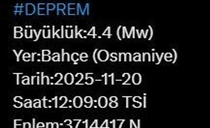 Afet ve Acil Durum Yönetimi Başkanlığı (AFAD), Osmaniye iline bağlı Bahçe ilçesinde 4.4 büyüklüğünde bir depremin olduğunu bildirdi.