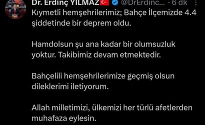 AFAD verilerine göre, saat 12.09’da merkez üssü Osmaniye'nin Bahçe ilçesi olan 4.4 büyüklüğünde bir deprem meydana geldi. Depremin derinliği 8.8 kilometre olarak ölçüldü. Bu durum kent genelinde kısa süreli bir panik yaşanmasına sebep oldu; ancak daha sonra herhangi bir olumsuz durumun olmadığı bilgisi alındı.