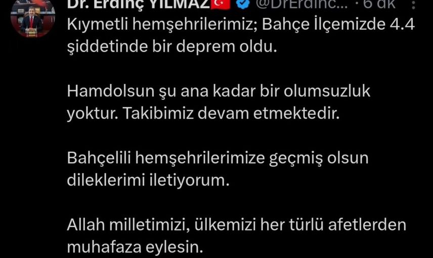 Yılmaz, deprem sonrasında ekiplerin gerekli kontrolleri yaptığını belirterek, "Vatandaşlarımıza geçmiş olsun dileklerimi iletiyorum" ifadelerini kullandı. Bütün birimlerin olay bölgelerinde çalışmalarını sürdüreceği ifade edildi.