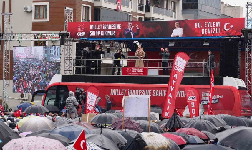 Cumhuriyet Halk Partisi Genel Başkanı Özgür Özel, Merkezefendi Belediyesi tarafından hayata geçirilen Atatürk Bilim Merkezi’nin açılışı için Denizli’deydi. Açılış törenine katılan onlarca vatandaş, yağmur altında miting alanında bir araya geldi.