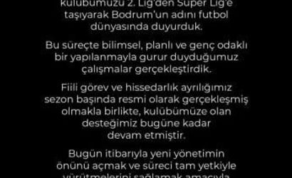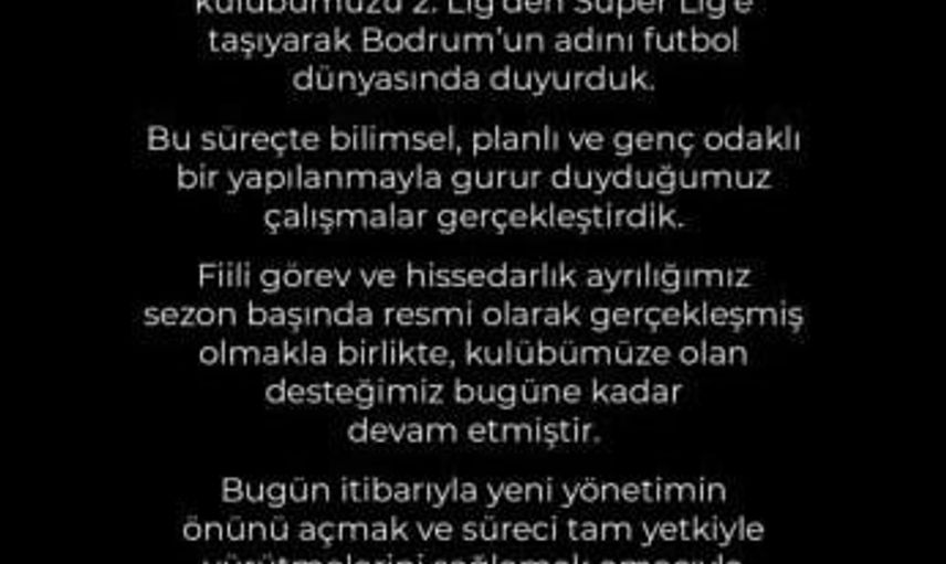 Bodrum Futbol Kulübü'nün yöneticilerinden Öztürk Ailesi, kulüpteki sorumluluklarını devrettiklerini açıkladı.