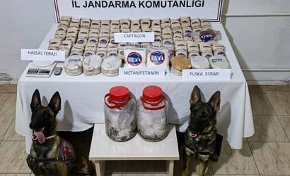 Göktepe Mahallesi'nde kaydedilen olayda, 100 bin adet Captagon hap, 1 kilo 600 gram metamfetamin ve 5 kilo 126 gram plaka esrar bulundu.