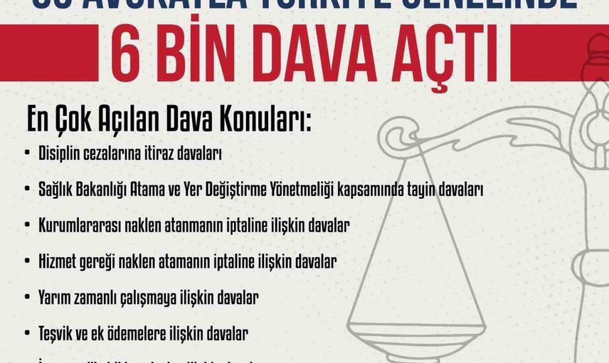 Sağlık ve sosyal hizmet alanındaki çeşitli adaletsizlikler, Sağlık-Sen Hukuk Birimi tarafından titizlikle incelenerek, gerekli hukuki süreç başlatılıyor. Türkiye genelinde toplamda 63 avukat ile hizmet veren bu birim, bugüne kadar 6 bin dava açmış durumda.