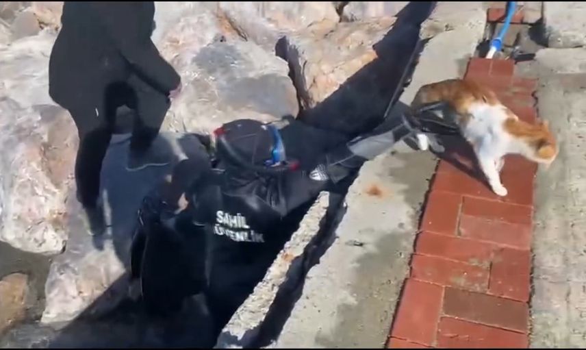 Balıkesir’in Edremit ilçesinde, bir iskelenin altında mahsur kalan kedi, Sahil Güvenlik Komutanlığı’na bağlı balık adamların severberliğiyle kurtarıldı. Kurtarma anları, ekiplerin kafa kameralarına yansıdı.