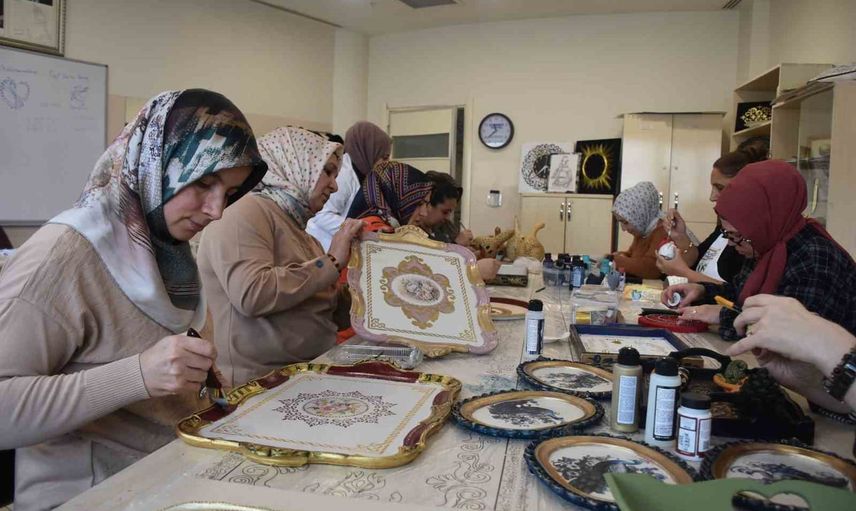 Katılımcılar, atıl durumda bulunan esyalara yeni bir hayat veriyor. Eski tepsiler, ahşap parçalar ve farklı materyaller, filografi, boyama ve rölyef teknikleri ile yeniden değerlendiriliyor. Bütün bu süreç, hem ekonomiye hem de çevreye katkı sağlıyor.