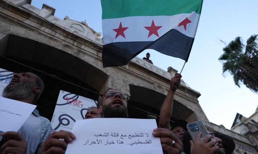 Şam'daki Hicaz Meydanı'nda toplanan kalabalık, Aksa bizimdir, İsrail ile normalleşmeye hayır, Golan toprakları Suriye'nindir, Hepimiz Gazze'yiz ve Hepimiz Sumud Filosu'yuz gibi sloganlarla desteklerini dile getirdi.