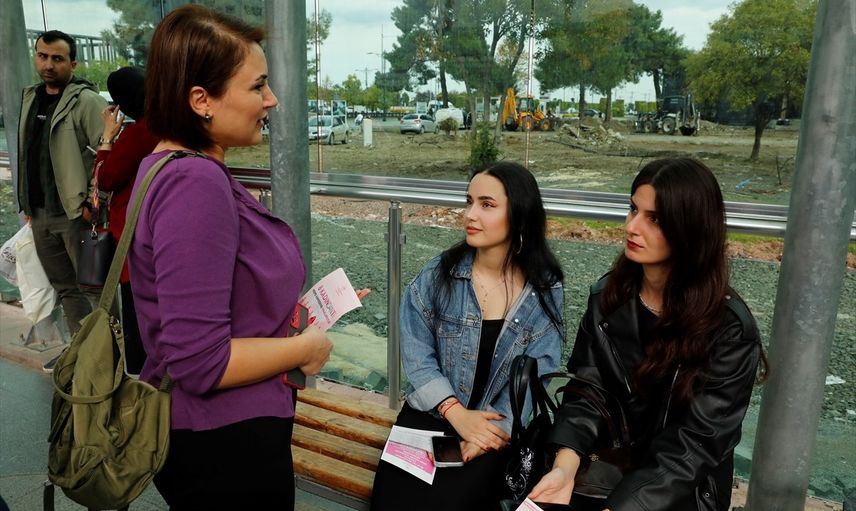 İl Sağlık Müdürlüğü'ne bağlı Kanser Birimi'nden Dr. Merve Altınışık, ekibiyle birlikte tramvaya bindi ve kadın yolculara bilgilendirme broşürleri dağıttı.