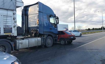 Samsun-Sinop karayolu üzerinde gerçekleşen bir kazada, tırın çarptığı otomobil 20 metre sürüklendi.
