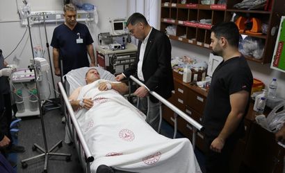 Şanlıurfa'nın Eyyübiye ilçesinde polis merkezi önündeki nöbetçi polis bıçaklı saldırıda yaralandı, zanlı gözaltına alındı. İl Emniyet Müdürü Atilla Aksoy (sağda), polis memurunu tedavi gördüğü hastanede ziyaret ederek doktorlardan sağlık durumu hakkında bilgi aldı.