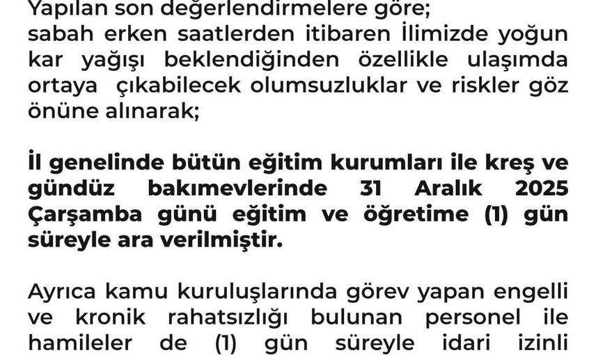 Valilikten yapılan resmi açıklamada, "Yapılan son değerlendirmelere göre; sabah erken saatlerden itibaren ilimizde yoğun kar yağışı beklenmektedir. Özellikle ulaşımda yaşanabilecek olumsuz durumlar ve riskler nedeniyle, il genelindeki tüm eğitim kurumları ile kreşler ve gündüz bakım evleri 31 Aralık 2025 Çarşamba günü tatil edilmiştir." denildi.