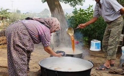 "Üzümleri iyice yıkadıktan sonra çuvallara koyuyoruz. Erkekler, çuvalların içindeki üzümleri ayaklarıyla ezerek üzüm suyunu çıkarıyor. Elde edilen şıra, büyük kazanlarda saatlerce kaynatılarak pekmeze dönüştürülüyor. Daha sonra şişelere doldurup güneş görmeyen yerlerde kış için saklıyoruz."