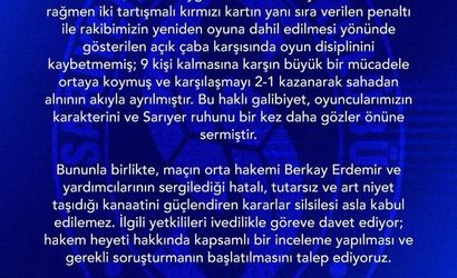 “Ancak, orta hakem Berkay Erdemir ve yardımcılarının sergilediği hatalı ve tutarsız kararlar kabul edilemez. İlgili yetkilileri ivedilikle göreve davet ediyoruz; hakem heyeti hakkında kapsamlı bir inceleme ve gerekli soruşturmanın başlatılmasını talep ediyoruz. Galibiyetimizin sevincini yaşarken, benzer yanlışların gelecekte tekrarlanmaması için endişelerimiz bulunmaktadır. Bu sürecin sonuna kadar takipçisi olacağız.”