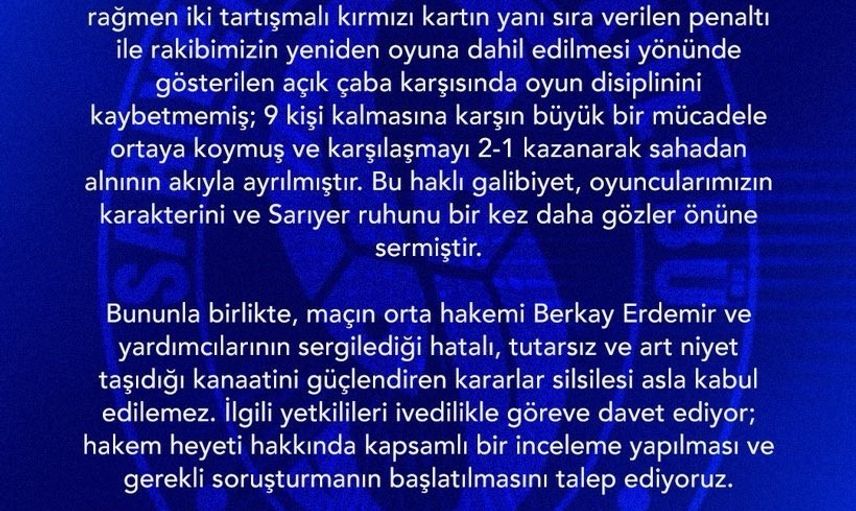 "Dün karşılaştığımız Vanspor mücadelesinde, maruz kaldığımız taraflı yönetim ve hakem heyetinin kararlarındaki tutarsızlık, camiamızda büyük bir üzüntü ve şaşkınlığa neden oldu. Takımımız, sahada uygulanan yanlı kararlara rağmen 9 kişi kalmasına rağmen büyük bir mücadele sergiledi ve karşılaşmayı kazandı. Bu galibiyet, oyuncularımızın karakterini ve Sarıyer ruhunu bir kez daha gözler önüne sermiştir."