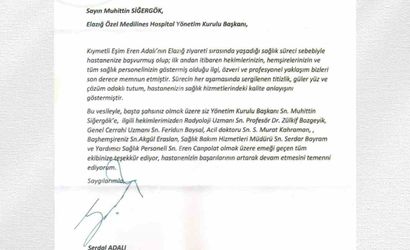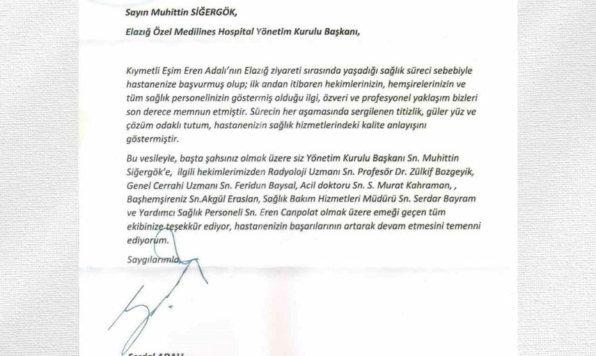 Beşiktaş Kulübü ve Türkiye Jokey Kulübü Yönetim Kurulu Başkanlığı görevini yürüten Serdal Adalı, eşinin Elazığ'daki tedavi süreci için Elazığ Medilines Hospital’a bir teşekkür mesajı iletti.