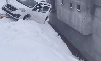 SİİRT’İN BAYKAN İLÇESİNDE BUZLU YOLDA KAYAN HAFİF TİCARİ ARAÇ BİR EVİN DUVARINDA ASILI KALDI.