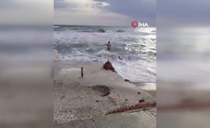 Emin Yurdakul isimli vatandaş, soğuk havaya rağmen dalgaların yükselmesine aldırış etmeden denize koştu. Ancak, dalgaların etkisiyle kıyıdan fazla uzaklaşmadığı dikkatlerden kaçmadı.