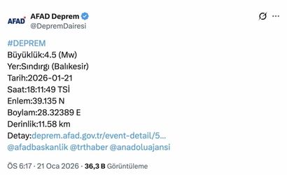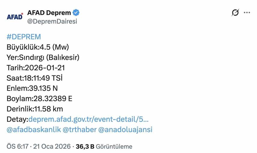 Depremin merkez üssü Sındırgı olarak belirlenirken, saat 18.11’de yaşandı. Yerin yaklaşık 11.58 kilometre derinliğinde gerçekleşen bu doğal olay, çevre ilçelerle birlikte Bursa’da da kısa süreli paniğe yol açtı.