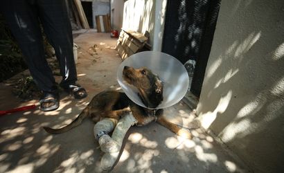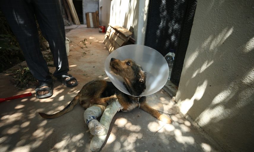 Balıkesir'in Sındırgı ilçesinde meydana gelen 6,1 büyüklüğündeki depremde binadan düşen molozun altında kalıp iki bacağı kırılan "Ateş" adlı köpek, tedavi altına alındı.