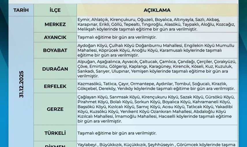 Sinop Valiliği'nden yapılan resmi açıklamaya göre, Türkeli ve Ayancık ilçelerinde taşımalı eğitim bir gün süreyle durduruldu. Merkez ilçe ile Boyabat, Erfelek, Durağan, Gerze ve Dikmen'in bazı bölgelerinde ise kısmi olarak taşımalı eğitime ara verilmiştir.