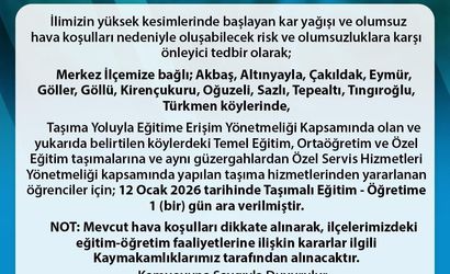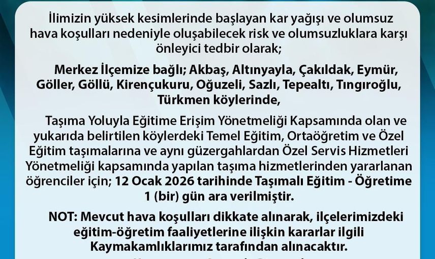 Valilikten yapılan duyuruda, potansiyel riskler ve olumsuz durumlarla başa çıkmak adına bu önlemin alındığı belirtildi. Alınan karara göre, Merkez ilçeye bağlı Akbaş, Altınyayla, Çakıldak, Eymür, Göller, Göllü, Kirençukuru, Oğuzeli, Sazlı, Tepealtı, Tıngıroğlu ve Türkmen köylerinde Taşıma Yoluyla Eğitime Erişim Yönetmeliği kapsamında gerçekleştirilen eğitim taşımaları durduruldu.