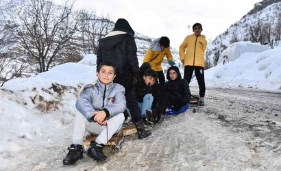 Şırnak’ın Beytüşşebap ilçesinde kar kalınlığı 2 metreyi bulunca, çocuklar kullanılmayan yolları kayak pistine çevirerek eğlencenin tadını çıkarıyor.