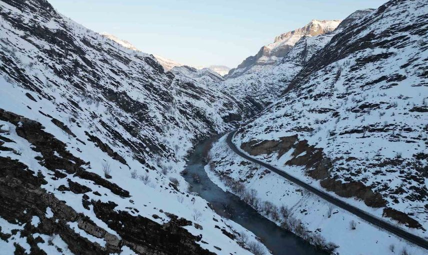 ŞIRNAK’TA KAR YAĞIŞI SONRASI KANLI DERE OLARAK BİLİNEN BÖLGELER BEYAZLARA İÇİNDE KALDI. HAVADAN GÖRÜNTÜLENEN BÖLGE GÖRSEL ŞÖLEN OLUŞTU.
