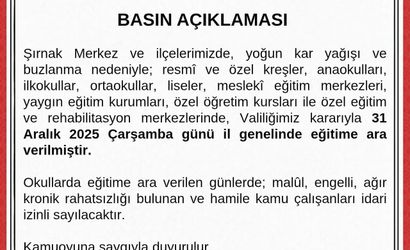 Şırnak Valiliği tarafından yapılan açıklamada, "Şırnak merkez ve ilçelerinde yoğun kar yağışı ile birlikte oluşan buzlanma nedeniyle, resmi ve özel kreşler, anaokulları, ilkokullar, ortaokullar, liseler, meslekî eğitim merkezleri, yaygın eğitim kurumları, özel öğretim kursları ve özel eğitim rehabilitasyon merkezlerinde eğitime ara verilmiştir." ifadesi kullanıldı.