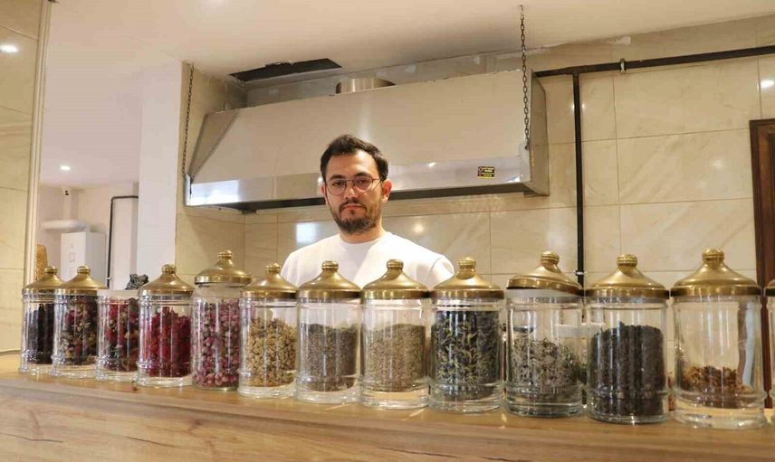 SİVAS’TA BİR KAFEDE HAZIRLANAN 50 FARKLI BİTKİ ÇAYI, MÜŞTERİLER VE İŞLETMECİNİN ORTAK KARARIYLA VERİLEN İLGİNÇ İSİMLERİ VE RENKLERİYLE YOĞUN İLGİ GÖRÜYOR.