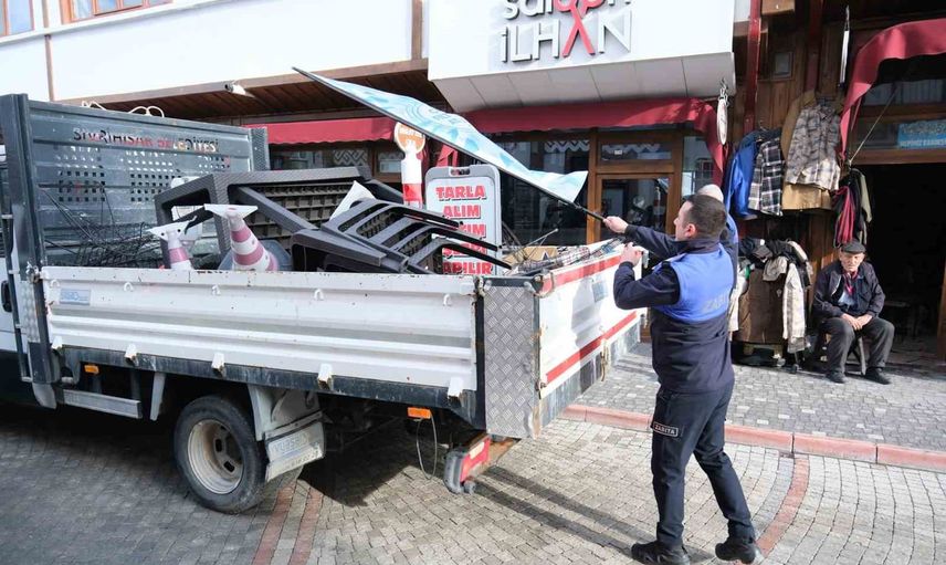 Eskişehir'in Sivrihisar İlçesi'nde, işyerlerinin önünde yer alan kaldırımları işgal eden duba, levha, tabela ve benzeri taşınabilir eşyalarla ilgili olarak zabıta ekipleri denetimlerini sürdürüyor.