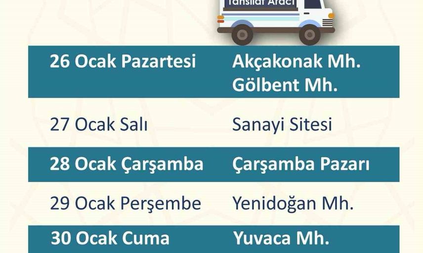 Mobil tahsilat aracı, 26 Ocak Pazartesi günü Akçakonak ve Gölbent mahallelerinde, 27 Ocak Salı günü Sanayi Sitesi’nde, 28 Ocak Çarşamba günü Pazaryeri’nde, 29 Ocak Perşembe günü Yenidoğan Mahallesi’nde; son olarak 30 Ocak Cuma günü ise Yuvaca ve Atburgazı mahallelerinde hizmet verecek.