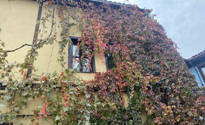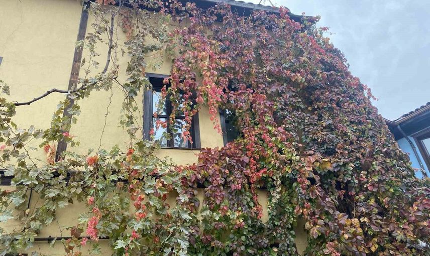 Eskişehir'de, sonbaharın farklı tonlarına bürünen bitkilerle kaplanmış bir tarihi yapı, kartpostallık bir görünüm oluşturuyor.